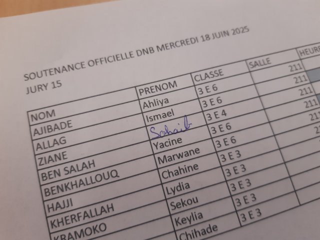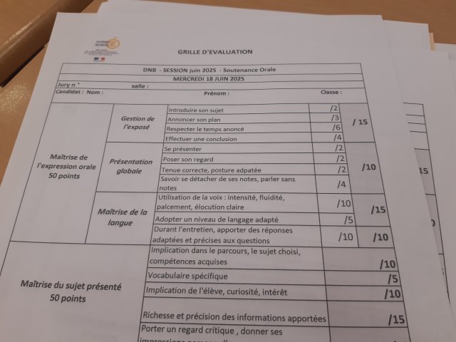 Mercredi 18 juin. Les 6e, 5e et 4e n’ont pas cours. Les 3e passent l’épreuve orale du Diplôme National du Brevet. Notée sur 100 points (sur les 800 du DNB), elle consiste en un exposé oral de 5 minutes suivi de 5 minutes de questions du jury. Les élèves ont pu, au cours de l’année, se préparer lors de deux oraux blancs. Ce fut l’occasion de les conseiller afin qu’ils améliorent leur prestation. Ils pouvaient, pour le « vrai » oral, reprendre les mêmes sujets ou en changer.